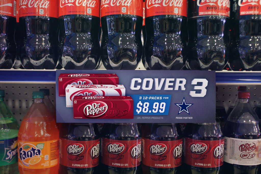 All Stripes’ point-of-purchase campaign pieces exhibits football-leaning language and athletic action elements through textural treatments, diagonal-striped graphics and typography treatment. Following the campaign launch, across 700+ Stripes stores, drink sales rose 2.8%.